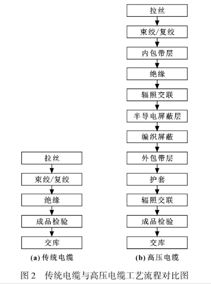 目前,電動(dòng)汽車(chē)用高壓電纜的發(fā)展迅速,對(duì)應(yīng)的成型工藝也與傳統(tǒng)電纜的成型工藝大有不同,兩種工藝流程對(duì)比如圖2所示。